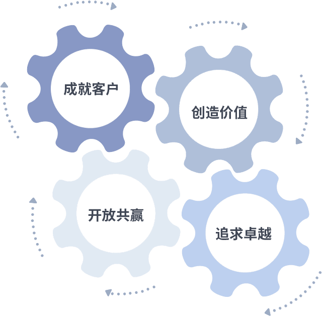 成就客户是一切决策的出发点,,创造价值是衡量所有工作的标准,,追求卓越是我们做事做人的态度,,开放共赢是我们的格局也是最终的结果。。价值观的齿轮环环相扣,,推动着组织里的每个人不断向前。。