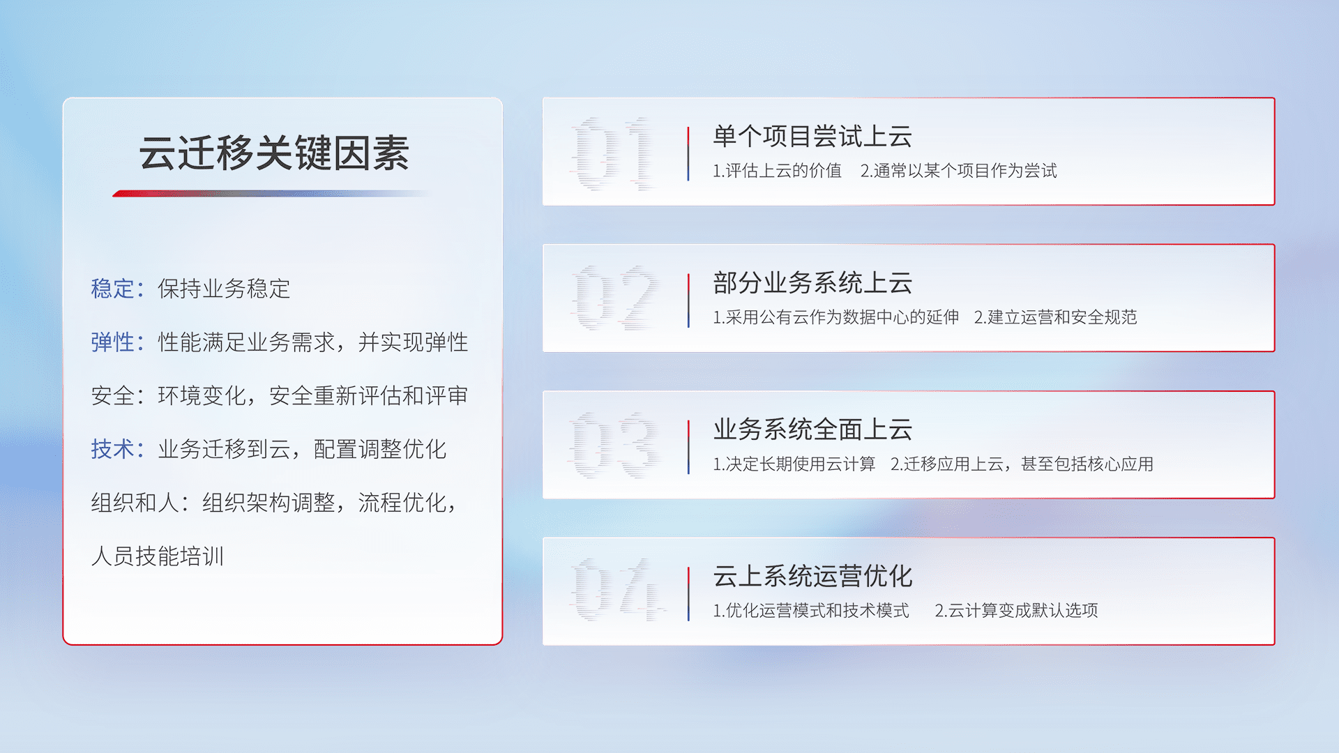 结合实际业务,,从规划设计、、、云平台选型、、、云原生改造、、、数据迁移、、集成交付,,,迁移全过程为客户识别最佳上云路径,,做好风险识别管理,,,设计网络架构、、、身份权限、、、、安全审计合规、、、操作审计、、、、日志审计、、、监控告警策略、、多站点容灾设计等,,对云上基础设施进行整体规划,,,提升IT治理水平,,以满足弹性、、、、高可用、、、、高性能的需求。。。