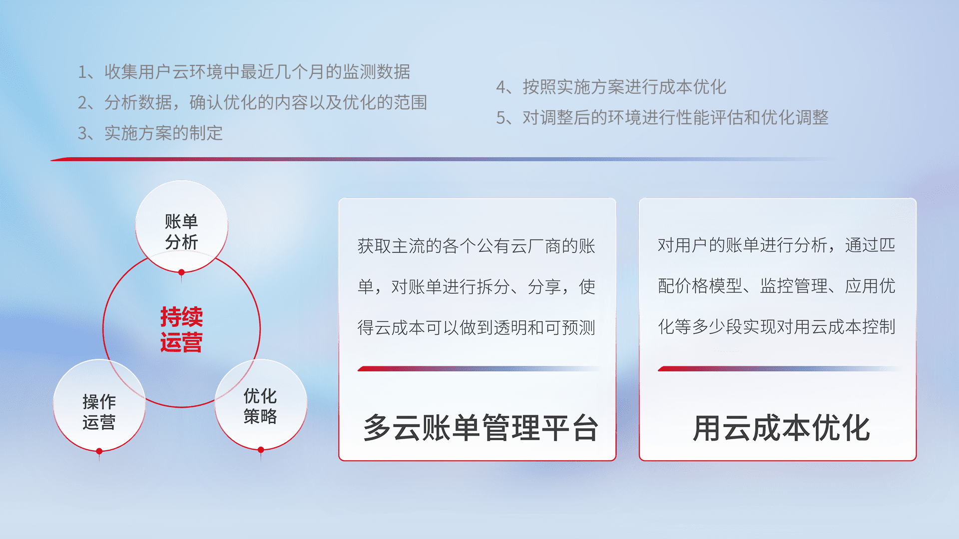 通过多云纳管,,,以统一的资源数据模型把客户的云资源进行抽象和封装,,,进而实现对多云资源的统一操作,,,,保障云资源管理的可靠性、、、、稳定性与可用性。。。量身定制化运维内容,,配置、、、开发运维、、、、补丁管理、、、、备份、、、监控、、认证和访问管理、、、、审计和日常巡检等,,,保障在用云过程中的可靠度,,,,稳定度以及高可用率。。